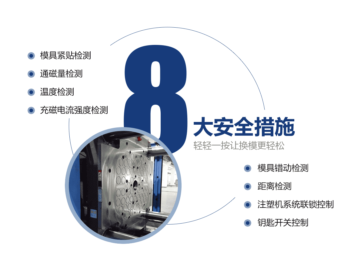 電永磁磁力模板大大提高注塑機(jī)換模效率。 自動(dòng)化注塑機(jī)的換模方法僅需3分鐘即可完成。特大型注塑機(jī)模板的換模時(shí)間從超過(guò)2小時(shí)減少到10分鐘。
