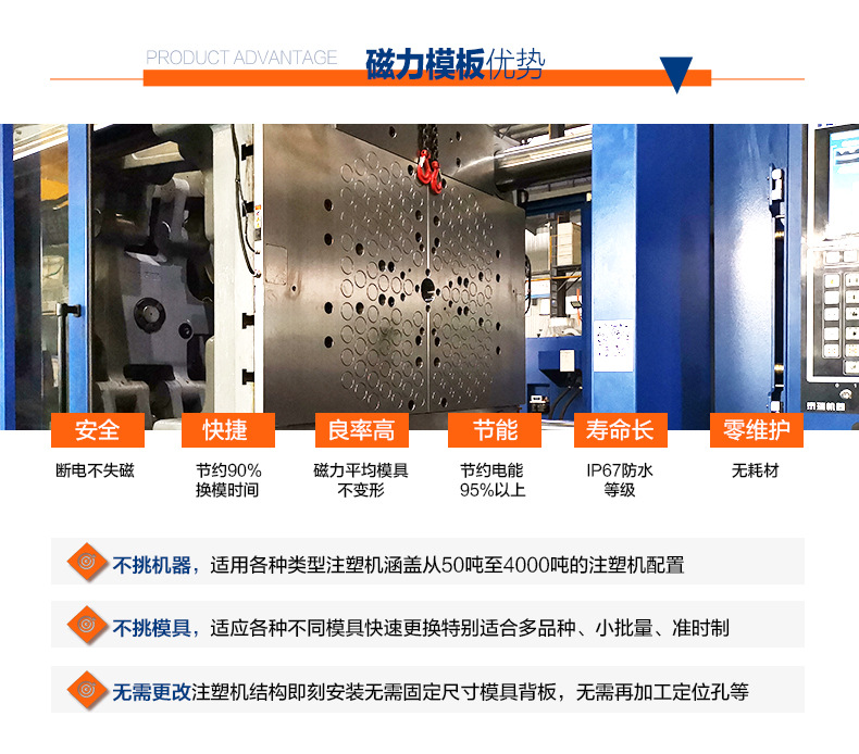 立式注塑機(jī)是目前中國發(fā)展最快的塑料機(jī)械之一,與工業(yè)發(fā)達(dá)國家的距離很近。 越來越多的制造業(yè)開始用磁性模板代替手動更換模具。 悍威磁電開發(fā)生產(chǎn)的磁性模板與立式注塑機(jī)的配套使用,增強(qiáng)了公司的核心競爭力。