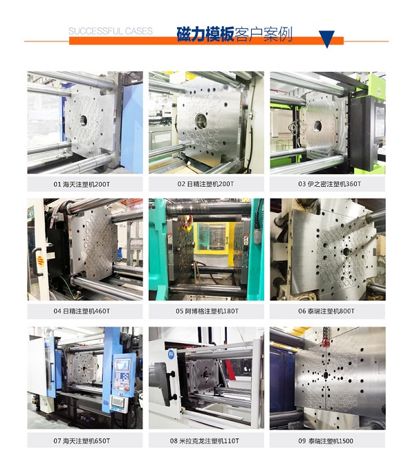 該系統(tǒng)的特點是:結(jié)構(gòu)和控制非常簡單,沒有任何機械的夾緊元件和動作,在模具背板與吸盤磁極的接觸面上,無論是中心還是外圍,都有電永磁夾緊。 適用于各種形式,規(guī)格的注塑機。